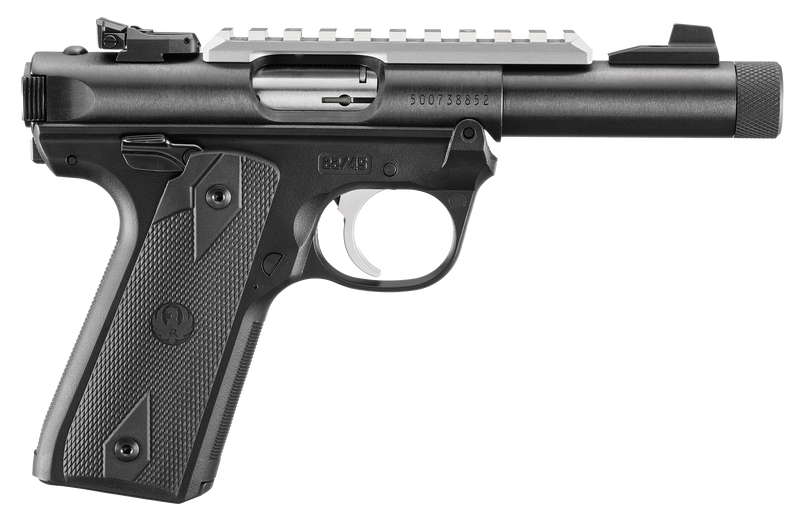 The Ruger Mark IV 22/45 is a semi-automatic rimfire pistol chambered in .22 LR with a 4.4" threaded steel bull barrel and 10+1 round capacity. Features include a blued Picatinny rail receiver, 1911-style checkered black polymer grip frame, adjustable rear sight, and suppressor-ready design with 1/2x28 thread pattern. Weighs 33.3 oz with one-button takedown for easy field-stripping.