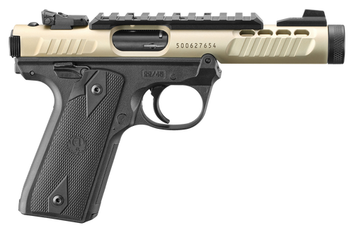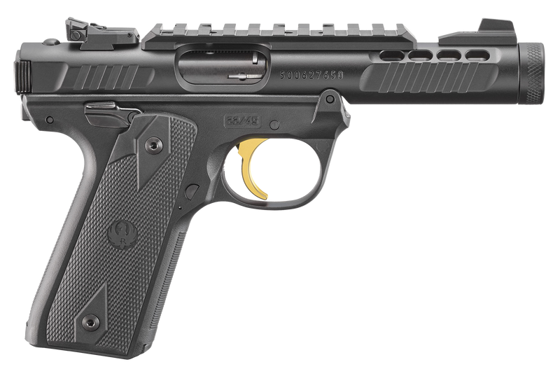 Semi-automatic .22 LR pistol with 4.4" threaded barrel and 10+1 capacity. Features a lightweight polymer frame, fixed front and adjustable rear sights, ambidextrous safety, and checkered 1911-style grips. Includes one-button takedown, picatinny rail, and weighs 25 oz.