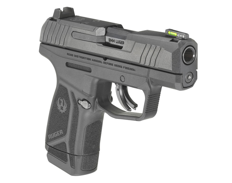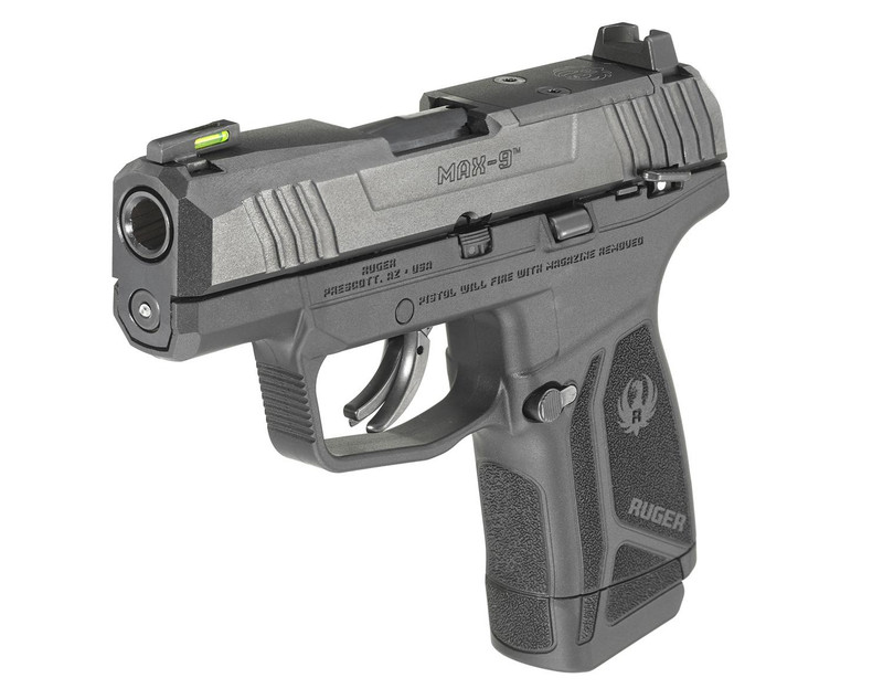 The Ruger Max-9 is a striker-fired semi-automatic pistol chambered in 9mm Luger with a 3.2" barrel and 12+1 round capacity. It features a through-hardened alloy steel slide with black oxide finish, tritium fiber optic sights, and is optic-ready for mounting red dot sights. The slim, lightweight design with glass-filled nylon grip frame and integrated trigger safety makes it suitable for concealed carry.