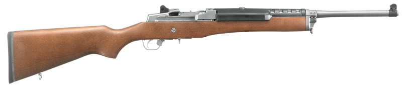 The Ruger Mini-14 Ranch is a semi-automatic rifle chambered in 5.56 NATO/.223 Rem with an 18.5" cold hammer-forged barrel and 5+1 capacity. Features a satin stainless steel finish, hardwood fixed stock, adjustable rear peep sight, and integral scope mount on the receiver. Weighs 7 lbs with an overall length of 38".