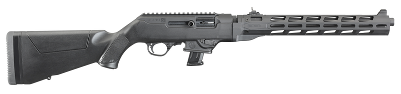 Semi-automatic rifle chambered in 9mm Luger with a 16.12" fluted barrel and 10+1 capacity. Features a Type III hard-coat anodized aluminum receiver, synthetic stock, M-LOK accessory slots, free-float handguard, and adjustable ghost ring rear sight with protected blade front sight. Weighs 7 lbs and includes interchangeable magazine wells compatible with Ruger Security-9 and Glock magazines.