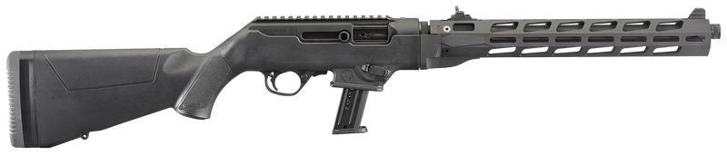 The Ruger PC Carbine is a semi-automatic rifle chambered in 9mm Luger with a 16.12" fluted and threaded barrel. It features a free-float aluminum handguard with M-LOK accessory slots, adjustable ghost ring rear sight, protected blade front sight, and synthetic stock. The rifle weighs 7 lbs, has a 34.37" overall length, and ships with a 10+1 capacity magazine well compatible with SR-Series/Security-9 and Glock magazines.
