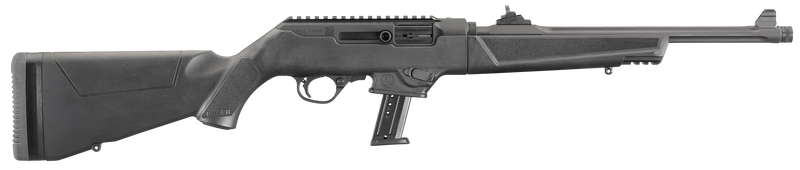 Semi-automatic pistol caliber carbine chambered in 9mm Luger with a 16.12" cold hammer-forged, fluted and threaded barrel. Features a black Type III hardcoat anodized aluminum receiver with Picatinny rail, adjustable ghost ring rear sight with protected blade front sight, and black synthetic stock. Weighs 6.8 lbs with an overall length of 34.37" and accepts both Ruger SR-Series and Glock magazines.