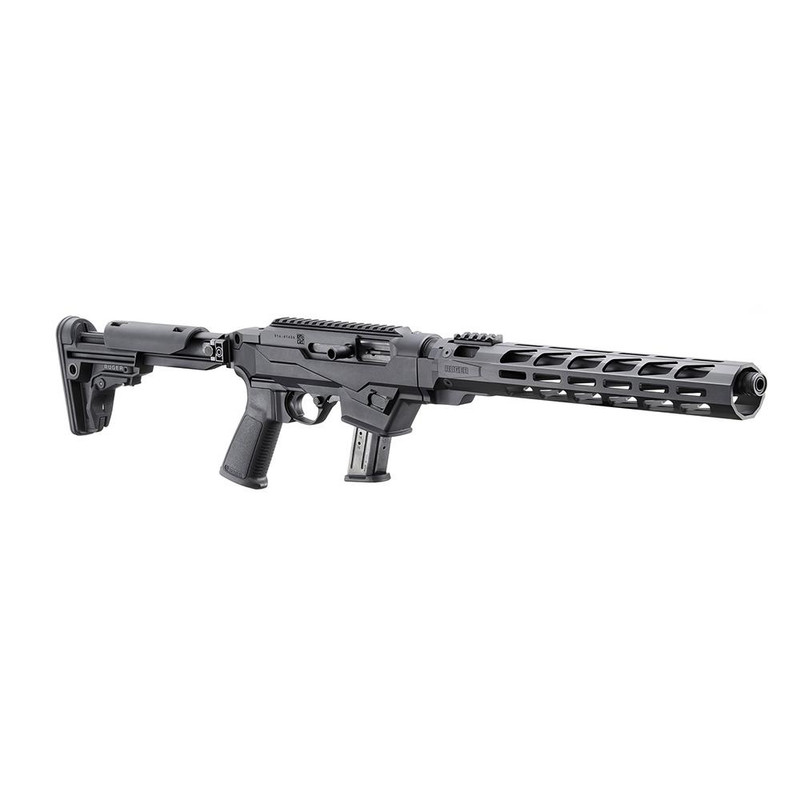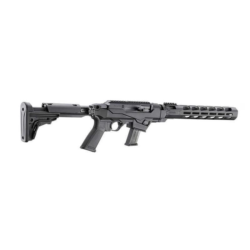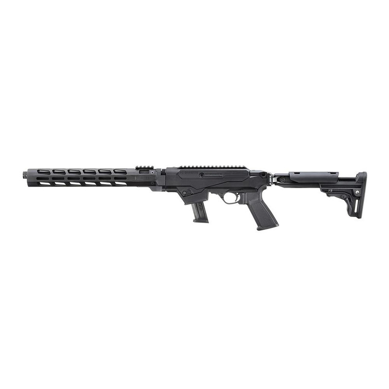 Semi-auto rifle chambered in 9mm Luger with a 16.12" fluted, threaded barrel and 10+1 capacity. Features a reversible folding synthetic stock, M-LOK handguard, factory-installed optics rail, and interchangeable magazine wells compatible with Ruger SR-Series and Glock magazines. Weighs 7.3 lbs with an overall length of 33.75".