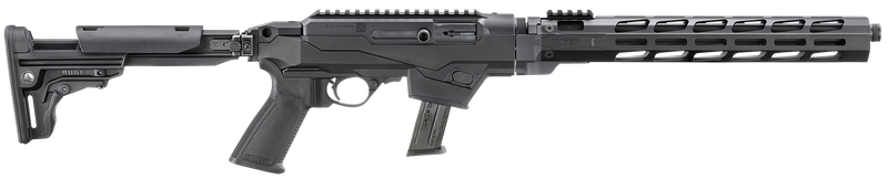 Semi-automatic rifle chambered in 9mm Luger with a 16.12" cold hammer-forged fluted and threaded barrel (1/2x28), 17+1 round capacity, and aluminum receiver. Features a reversible folding adjustable synthetic stock, M-LOK handguard, factory-installed picatinny rail for optics, and interchangeable magazine wells compatible with Ruger SR-Series and Glock magazines. Weighs 7.3 lbs with an overall length of 33.75".