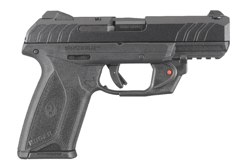 The Ruger Security-9 is a striker-fired semi-automatic pistol chambered in 9mm Luger with a 4" alloy steel barrel and 15+1 round capacity. Features include a black oxide serrated steel slide, black polymer frame with Picatinny rail, adjustable rear/fixed front sights, manual safety, and factory-installed Viridian E-Series red laser. Weighs 24.3 oz with an overall length of 7.24".