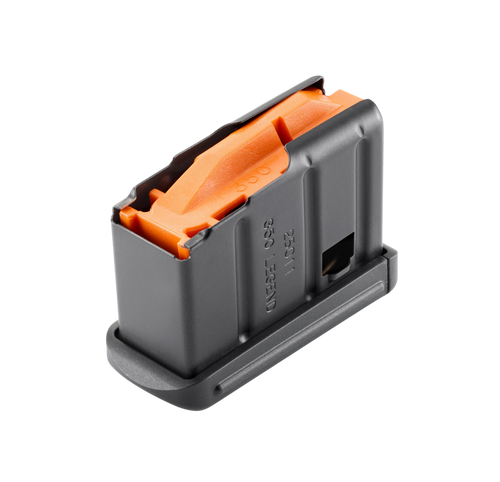 5-round rotary magazine for Ruger American Rifle chambered in .223 Rem, 5.56 NATO, 204 Ruger, and .300 Blackout. Features black polymer construction and fits flush with the stock for smooth feeding. Compatible with Ruger American short action magazine well assembly.