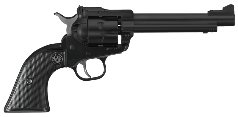 Single-action revolver chambered in .22 LR with convertible .22 WMR cylinder, 5.5" cold hammer-forged blued barrel, and 6-round capacity. Features adjustable rear and ramp front sights, black checkered hard rubber grips, transfer bar safety, and weighs 33 oz. Includes two cylinders for dual-caliber versatility.