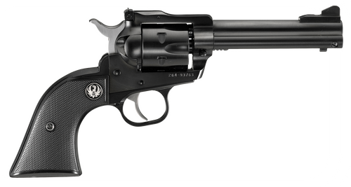 Single-action revolver chambered in .22 LR with included convertible cylinder for .22 WMR, featuring a 6.5" cold hammer-forged blued alloy steel barrel, 6-round capacity, and adjustable rear/ramp front sights. Transfer bar safety mechanism and exposed hammer with black checkered rubber grips; weighs 35 oz.