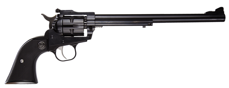 Single-action revolver chambered in .22 LR with included .22 WMR conversion cylinder, featuring a 9.5" cold hammer-forged barrel and blued finish. Equipped with adjustable rear and ramp front sights, black checkered hard rubber grips, and Ruger's patented transfer bar mechanism for safety. Weighs 39 oz with an overall length of 15 inches.
