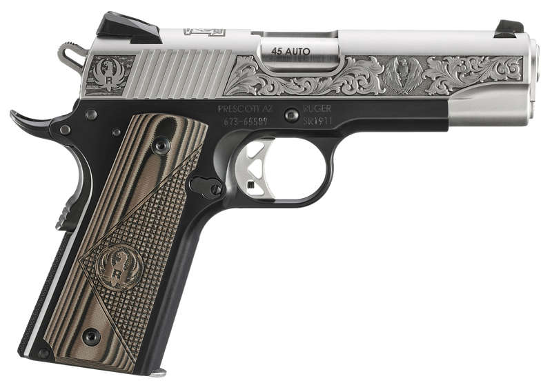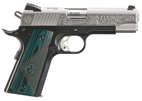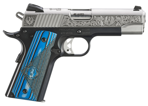 Semi-automatic 1911-style pistol chambered in 45 ACP with a 4.25" barrel and 7+1 capacity. Features a lightweight aluminum frame with low-gloss stainless steel slide, brown and black deluxe checkered G10 grips, and drift-adjustable Novak 3-dot sights. The Prescott, AZ Edition model includes fine engraving on the slide with the Ruger logo and bald eagle design, weighing 29.3 oz.
