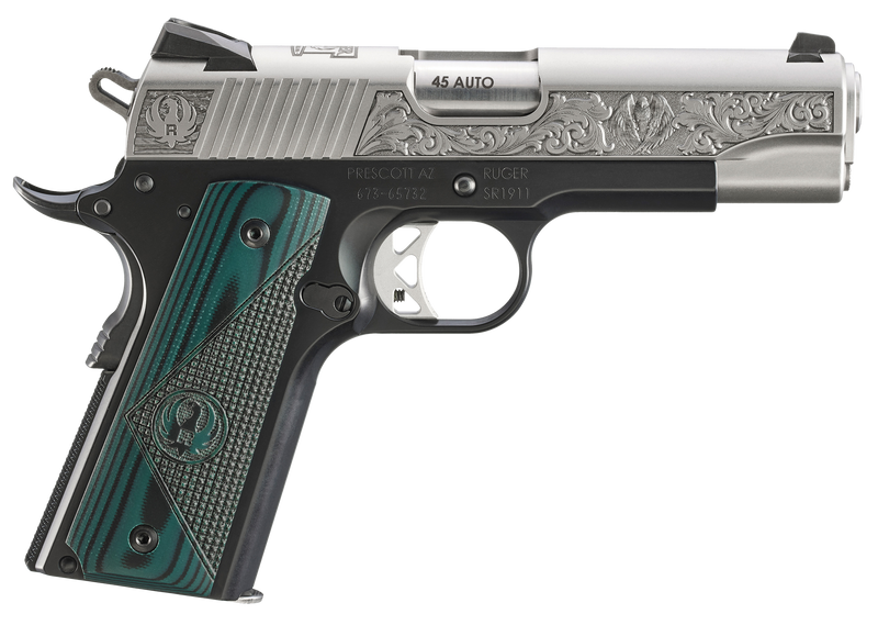Ruger SR1911 Commander .45 ACP 4.25" 7rd Pistol, Black/Stainless with Green G10 Grips - 16704