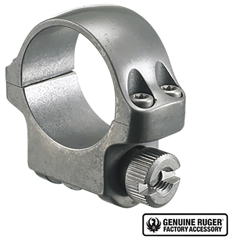 Single scope ring designed to hold a scope with a 1-inch tube diameter and up to 32mm objective lens diameter. Features a low profile height of 0.812 inches with a target grey stainless steel finish. Made from steel material as a genuine Ruger factory accessory.