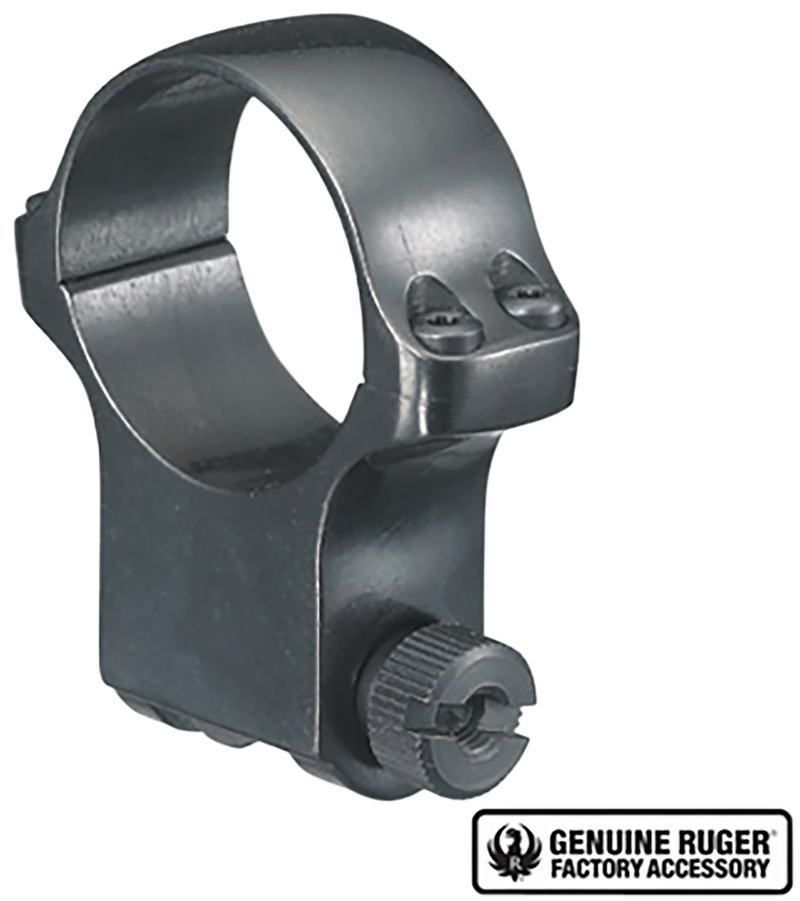 Single scope ring designed to accept 30mm tube diameter scopes with up to 62mm objective lens diameter. Features extra-high profile (1.187" height) and blued steel construction for secure scope mounting. Sold individually as a genuine Ruger factory accessory.