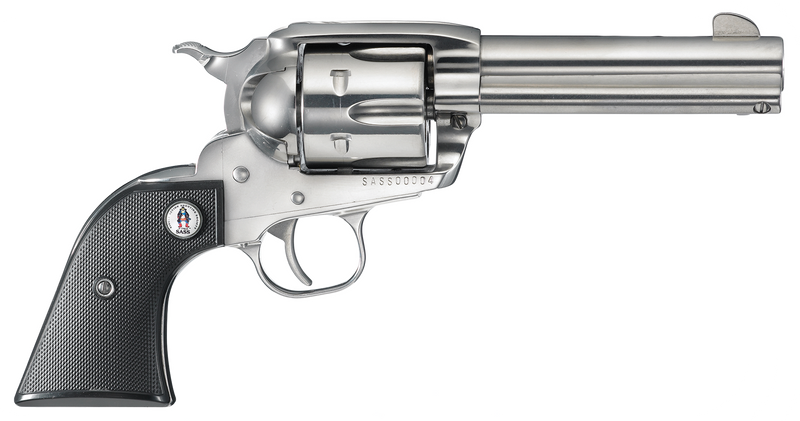 Single-action revolver chambered in .357 Magnum with 4.62" barrel and 6-round capacity. Features high-gloss stainless steel finish, black checkered polymer grips with SASS logo medallion, fixed blade front and integral rear sights, and Montado-style hammer. Includes patented reverse indexing pawl for easier loading/unloading, transfer bar safety, and commemorative two-gun case. Weight: 45 oz, Overall length: 10.25".