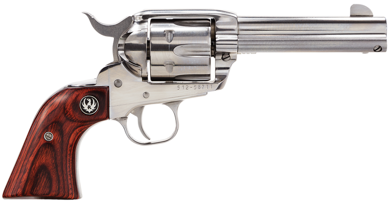Single-action revolver chambered in 357 Magnum/38 Special with a 4.62" barrel and 6-round capacity. Features a high-gloss stainless steel frame and cylinder, hardwood grips, fixed blade front and integral rear sights, and a patented transfer bar safety mechanism. Weighs 43 oz with an overall length of 10.5".