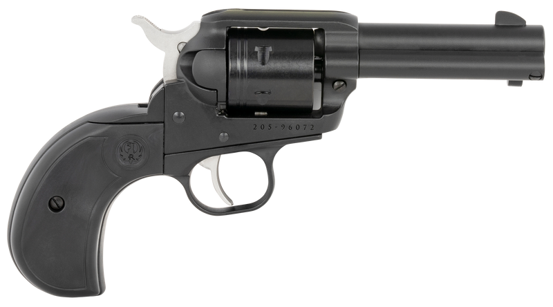 The Ruger Wrangler is a single-action revolver chambered in .22 LR with a 3.75" barrel, 6-round capacity, and black Cerakote finish on steel barrel and aluminum frame. Features an exposed hammer, blade front and integral rear sights, and black birdshead grip for a compact profile. Transfer bar mechanism and loading gate interlock provide security against accidental discharge.