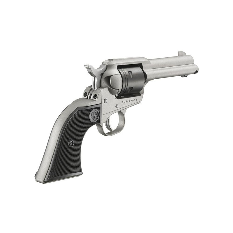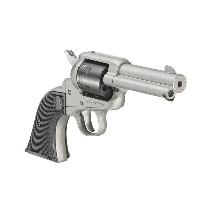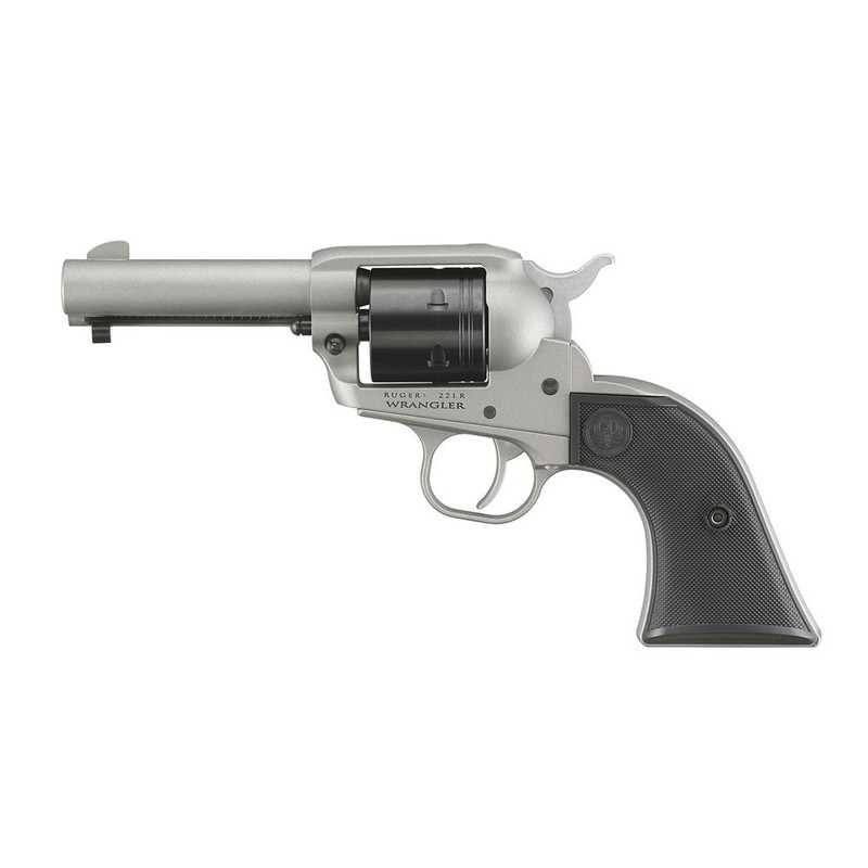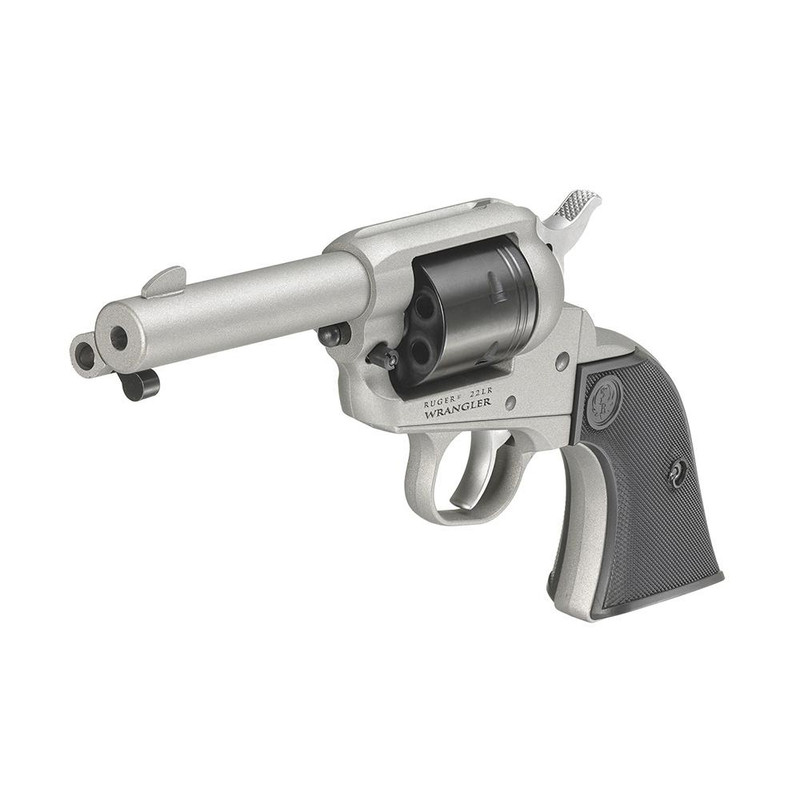 The Ruger Wrangler is a single-action revolver chambered in .22 LR with a 3.75" barrel and 6-round capacity. It features a Silver Cerakote finish over an aluminum alloy frame with checkered synthetic grips, blade front sight, and integral notch rear sight. A transfer bar mechanism and loading gate interlock provide security against accidental discharge.
