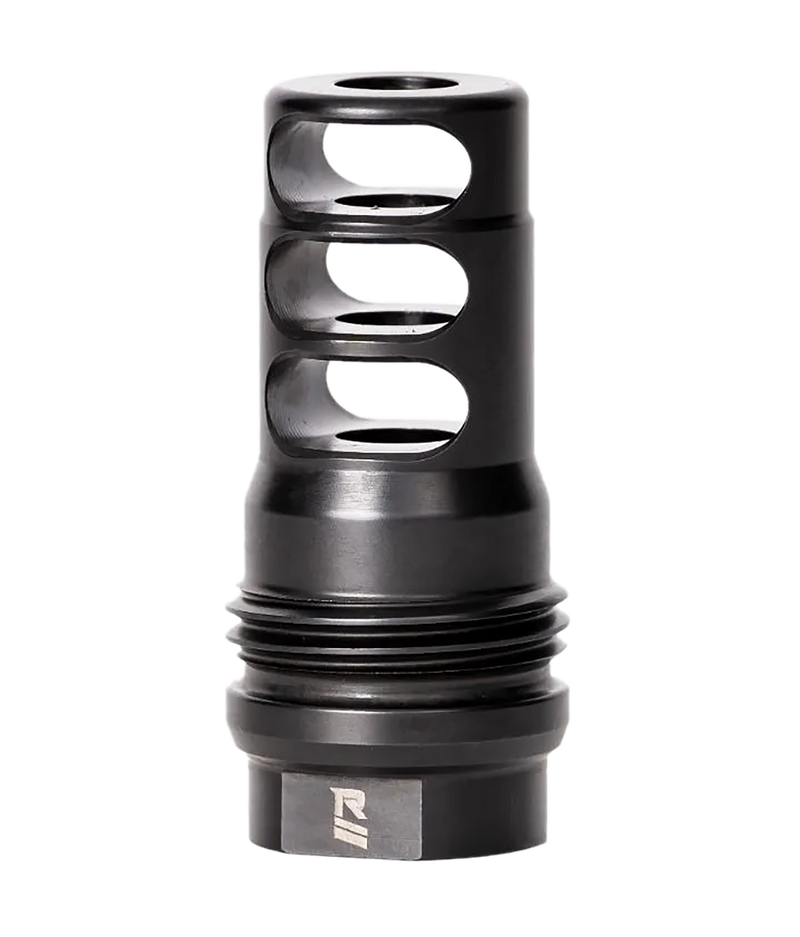 This 3-port muzzle brake is chambered for 7.62 NATO/.308 Winchester and features a 5/8x24 thread pitch for compatibility with Rugged Suppressors rifle and multi-caliber suppressors via their Dual Taper Locking System. The brake reduces recoil when shooting unsuppressed and includes timing shims; overall length is approximately 2.16 inches.