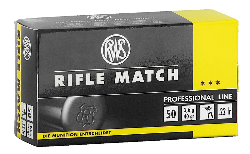 RWS Rifle Match Professional Line ammunition in .22 LR with 40-grain lead round nose bullets. Designed for target shooting and hunting applications, this brass-cased ammunition delivers 1082 fps muzzle velocity and 104 ft-lbs of energy. Sold in 50-round boxes, with 100 boxes per case.