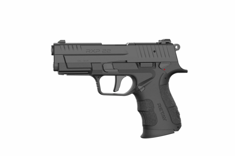 The Retay RXP22 is a .22 LR semi-automatic pistol with a 4" barrel and double/single action trigger. It features target-style adjustable sights, a reversible magazine release, and an integrated Picatinny rail for accessory mounting. The pistol includes two 10-round magazines and weighs 1 lb. 8 oz.