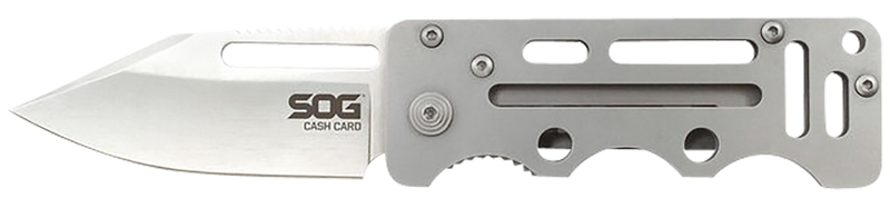 The SOG Cash Card is a compact folding knife featuring a 2.75" clip point blade made from 8Cr13MoV stainless steel with a satin finish. The knife has a silver skeletonized stainless steel handle and weighs just 2 oz, making it ideal for everyday carry or backup use.