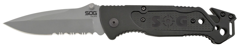 The SOG Escape is a 3.40" folding knife with a clip point blade featuring partial serration, constructed from 9Cr18MoV stainless steel with a bead blasted finish. The black anodized aluminum handle includes a thumb stud opening mechanism and comes with a belt clip for carry. Overall length when open is 8.20" with a total weight of 4.80 oz.