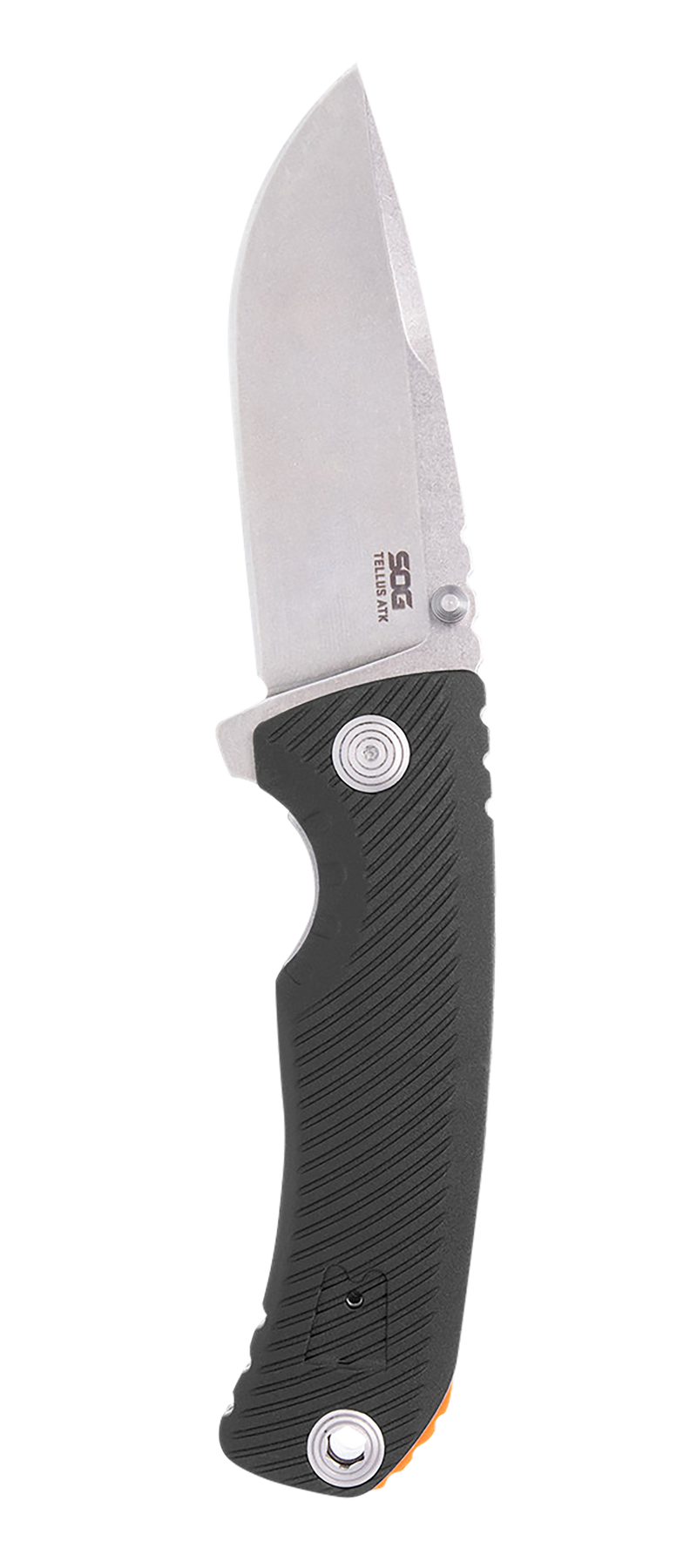 The SOG Tellus ATK is a 3.5" folding knife featuring a stonewashed Cryo 440C stainless steel clip point blade with a plain edge and thumb stud opening mechanism. It has a glass reinforced nylon handle in black with orange backspacer accents and includes a belt clip for carry.
