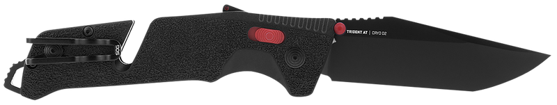 The SOG Trident AT is a 3.70" folding knife featuring a Cryo D2 steel tanto blade with a plain edge and thumb stud opening mechanism. The black GRN handle with red accents includes a line cutter and glass breaker for emergency situations, making it suitable for tactical, survival, and everyday carry applications.