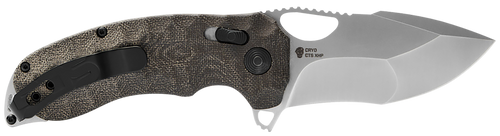 The SOG Kiku XR LTE features a 3.02" Cryo CTS XHP tanto blade with a plain edge and thumb slot opening mechanism. The knife has a deep textured black linen micarta handle, weighs 4.10 oz, and includes a belt clip for carry. Overall length is 7.32" when open, making it suitable for general cutting tasks and outdoor use.