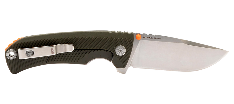 The SOG Tellus is a 3.65" folding clip point knife with a stonewashed Cryo 440C stainless steel blade and olive drab textured handle. It features a thumb stud opening mechanism and weighs 5.80 oz with an overall length of 8.40" when closed. This everyday carry knife is designed for general cutting tasks and outdoor use.