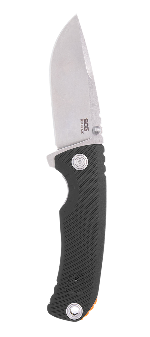 The SOG Tellus is a 3.65" folding knife with a stonewashed Cryo 440C stainless steel clip point blade and plain edge. It features a wolf gray textured handle, thumb stud opening mechanism, and an overall length of 8.4" when open. Weighing 5.8 oz, this is a compact everyday carry or utility knife.