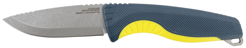 The SOG Aegis FX is a fixed blade knife featuring a 3.70" drop point blade made from 4116 Krupp stainless steel with a stonewashed finish. The knife has an indigo handle with acid accents, weighs 4.70 oz, and comes with a nylon sheath for carry and protection.