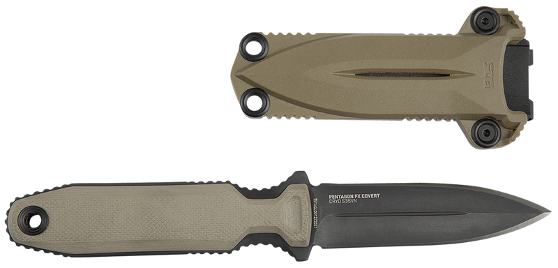 The SOG Pentagon FX Covert features a 3.41" spear point blade made from Black Titanium Nitride Cryo CPM S35VN steel with a plain edge. The knife has a Flat Dark Earth G10 handle, weighs 3.90 oz, and comes with a GRN sheath. With a total length of 7.52", it is designed as a versatile fixed blade for tactical and outdoor applications.
