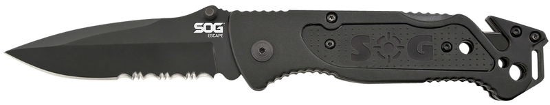 The SOG Escape is a 3.40" clip point folding knife with a part serrated 9Cr18MoV stainless steel blade and black anodized aluminum handle. It features a thumb stud opening mechanism, built-in cord/seatbelt cutter, glass breaker, and wire stripper, with an included belt clip for carry. Overall length is 8.20" when open and weighs 4.80 oz.