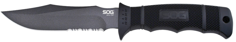 The SOG Seal Pup is a 4.75" fixed blade knife featuring a clip point blade made from AUS-8A stainless steel with partial serration and powder coat finish. It has a black handle with raised diamond pattern grip and comes with a Kydex sheath. The knife has an overall length of 9" and weighs 5.40 oz, making it suitable for tactical and outdoor applications.