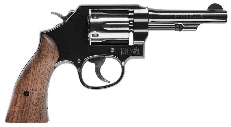 Smith & Wesson Model 10 Classic is a double-action/single-action K-Frame revolver chambered in 38 Special +P with a 4" blued carbon steel barrel and 6-round capacity. Features fixed sights, wood grips, and no internal lock mechanism. Weighs approximately 2.16 lbs with an overall length of 8.87".
