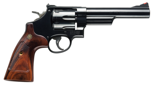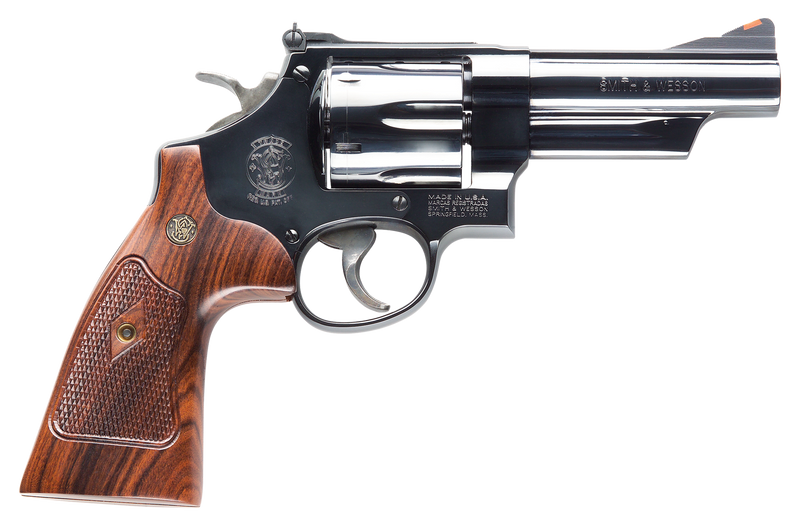 Smith & Wesson Model 29 Classic is a double/single action revolver chambered in .44 Rem Mag with a 4" blued barrel, 6-round N-frame cylinder, and adjustable sights. Features a checkered square butt walnut grip and carbon steel construction, weighing 44.1 oz. A classic design blending traditional aesthetics with modern manufacturing.