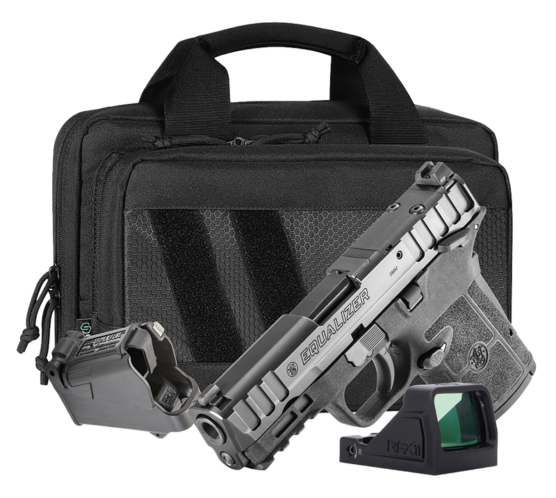 The Smith & Wesson Equalizer is a micro-compact semi-automatic pistol chambered in 9mm Luger with a 3.68" barrel, internal hammer, and ambidextrous thumb safety. This optics-ready model features a serrated slide, Picatinny rail, and weighs 22.9 oz. The bundle includes a Viridian RFX11 green dot reflex sight, three magazines (10rd, 13rd, 15rd), magazine loader, and Savior Specialist bag.