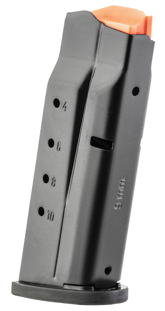 This is a 10-round handgun magazine chambered in 9mm Luger, designed to fit the Smith & Wesson M&P Shield Plus and Equalizer pistols. The magazine features a precision-machined steel body with a black oxide or black steel finish and a polymer floor plate for reliable feeding and durability.