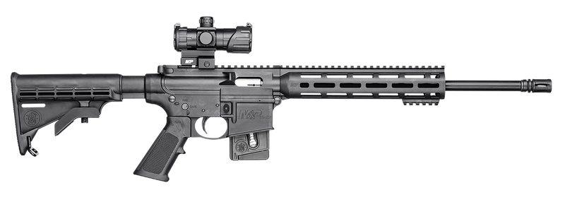 Semi-automatic .22 LR rifle with 16.5" threaded carbon steel barrel and 10+1 capacity. Features a 6-position adjustable stock, 10" M&P Slim Handguard with M-LOK, A2 flash hider, and includes an MP100 red/green dot optic. Weighs 5.2 lbs with overall length of 31.6" to 33.8".