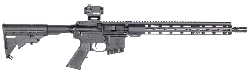 Semi-automatic AR-platform rifle chambered in 5.56 NATO/.223 Remington with a 16" threaded barrel and 10+1 capacity. Features a free-floating 15" M-LOK handguard, 6-position collapsible stock, and includes a Crimson Trace CTS-106 4.0 MOA red dot sight. Weighs 6.5 lbs and is state-compliant for restricted jurisdictions.