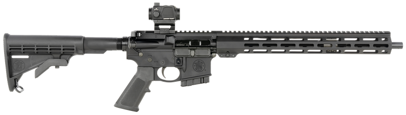 Semi-automatic AR-platform rifle chambered in 5.56 NATO/.223 Remington with a 16" heavy barrel and 1-in-8 twist rate. Features a fixed CAR stock, free-floating 15" M-LOK handguard, mid-length gas system, and includes a Crimson Trace CTS-106 red dot sight. Weighs 6.5 lbs with an overall length of 34" and comes with one 10-round magazine; compliant with state restrictions in CA, CT, DC, DE, IL, MA, NY, and WA.