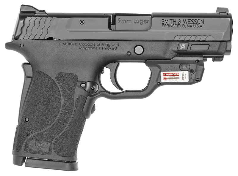 The M&P Shield EZ M2.0 is a micro-compact 9mm semi-automatic pistol featuring a 3.675" Armornite stainless steel barrel, serrated optic-ready slide, and grip safety with no thumb safety. This 8+1 capacity handgun includes two 8-round magazines with load-assist tabs, Picatinny-style rail, Crimson Trace red laser, and 3-dot white sights, weighing 23.8 oz and measuring 6.8" overall length.