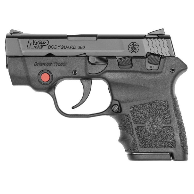 Semi-automatic pistol chambered in .380 Auto with a 2.75" stainless steel barrel and 6-round magazine capacity. Features an integrated Crimson Trace laser, fixed drift-adjustable sights, manual thumb safety with second-strike capability, and high-strength polymer frame. Includes two magazines with interchangeable finger groove and flat butt plate options.