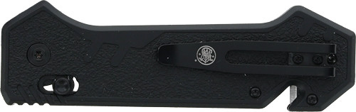 The S&W M&P Border Guard is a 3.5" folding knife featuring a pivot lock mechanism and strap cutter blade design. This knife is engineered for tactical and utility applications where quick deployment and cutting capability are essential. The black finish provides a professional appearance suitable for law enforcement and outdoor use.