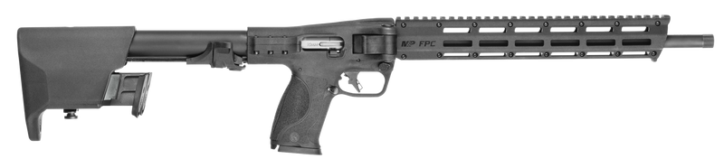 The Smith & Wesson M&P FPC is a semi-automatic pistol-caliber carbine chambered in 10mm Auto with a 16.25" threaded barrel and hard coat anodized aluminum receiver. It features a side-folding stock with magazine storage, M-LOK handguard, optic-ready Picatinny rail, flat-faced trigger compatible with S&W M&P magazines, and weighs 5.87 lbs. Ships with three 10-round magazines.
