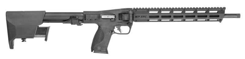 The Smith & Wesson M&P FPC is a semi-automatic pistol-caliber carbine chambered in 10mm Auto with a 16.25" threaded barrel and aluminum receiver. It features a side-folding stock with integrated magazine storage, M-LOK handguard, Picatinny rail, and includes three 15-round magazines. The rifle weighs 5.7-5.89 lbs with an overall length of 30.6" when extended.