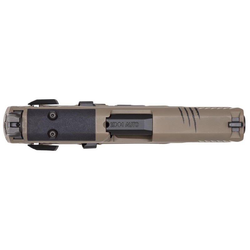 Semi-automatic striker-fired pistol chambered in 10mm Auto with a 4" barrel and 15-round capacity. Features an optics-ready slide with adapter plate, aggressive serrations, flat-face trigger, and enhanced grip texture. Includes two magazines and comes with Thumb Safety in this limited edition Backpacker variant.