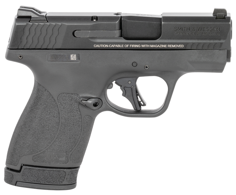 The Smith & Wesson M&P Shield Plus is a micro-compact striker-fired semi-automatic pistol chambered in 9mm Luger with a 3.1" Black Armornite stainless steel barrel and serrated slide. It features a manual thumb safety, flat face trigger, enhanced grip texture, fixed white dot sights, and includes two magazines (one 10-round and one 13-round). This lightweight polymer frame handgun weighs 20.2 oz and measures 6.1" overall length, making it ideal for concealed carry.